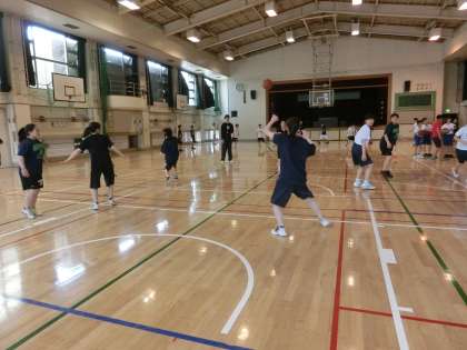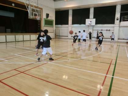 日曜日の午後、体育館では、バスケットボール部が活動しています。男女とも合わせの動きを練習しています。試合で使えるように練習しましょう。(遠藤)