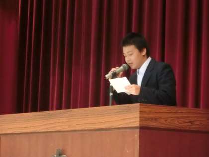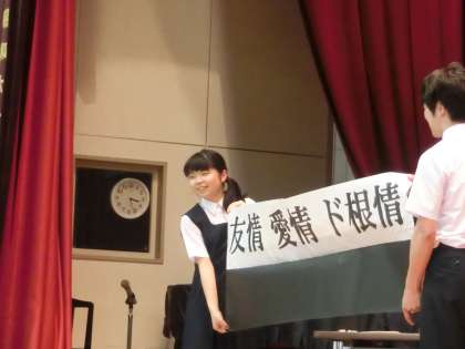 先日の体育委員会で、今年度の運動会のスローガンが決定し、本日の生徒総会で体育委員長から発表されました。今年度のスローガンは「友情 愛情 ド根性」です。(遠藤)