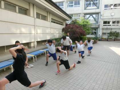 卓球部は、3つの班に分かれて練習しています。中庭では、下半身のトレーニング。多目的室では、基本のバックハンド打ち、格技室では、2、3年生がドライブの打ち分けの練習をしていました。(遠藤)