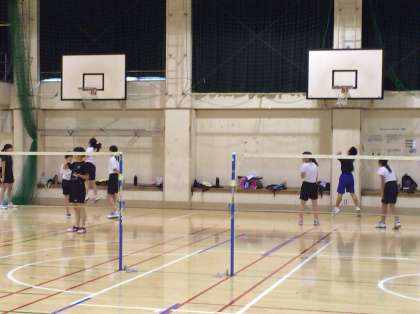 体育館では午前中バドミントン部が練習をしています。1年生はラケットの扱いがうまくなるよう必死に練習しています。