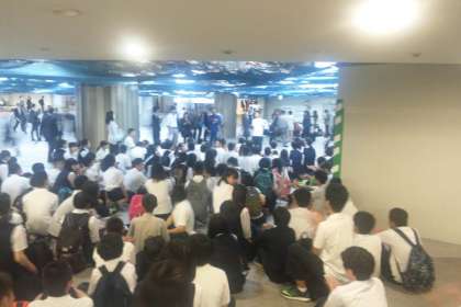 いよいよ出発式が始まりました。生徒たちは真剣に実行委員や先生の話を聞いていました。(田村)