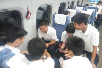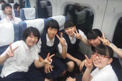 新幹線は新横浜駅を通過し、席を移動して生徒たちが交流している様子です。とても楽しそうにしてます。(田村)