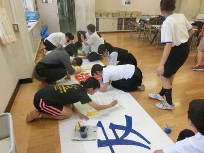 運動会スローガン横断幕の作成が始まりました。1,2年生の体育委員が協力して作成しています。運動会を盛り上げるために、すばらしいものに仕上げましょう。(遠藤)