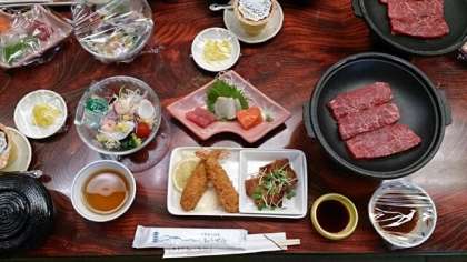 メインはミニステーキです。大広間でそろって食べる夕食。これぞ修学旅行です。(校長)