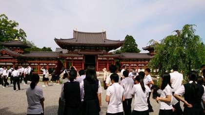 10円玉でおなじみの、宇治平等院鳳凰堂に来ています。極楽浄土の美しさです。(校長)