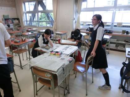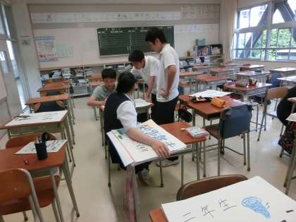 運動会の選手招集係になっている3年生の学級委員が、招集するためのプラカードを作っています。(遠藤)