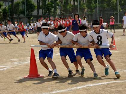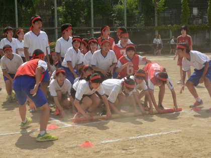 2年生のハリケーンの様子です。4人で力を合わせ、コーンをできるかぎり小さく回りましょう。(遠藤)