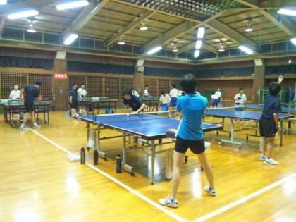 格技室では、卓球部が活動しています。2年生が、1年生にサーブの打ち方を教えていました。(遠藤)