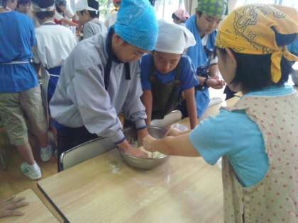 うどん作りが始まりました。力いっぱいこねましょう(遠藤)