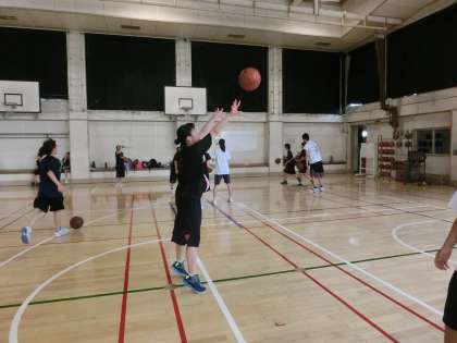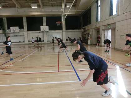 体育館では、バスケットボール部が活動しています。フットワーク中心のメニューで、みんな体育館を全力で走っています。今日は気温が高いので、水分補給をきちんとして、熱中症に注意しましょう。(遠藤)