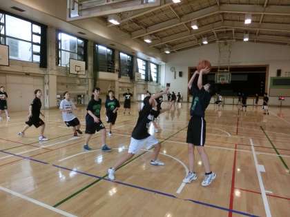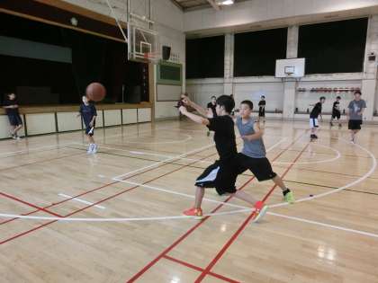 午前中の体育館では、バスケットボール部が活動しています。明日の練習試合に向けて、ディフェンスの練習をしています。新チーム初の練習試合で、初勝利をあげられるようにがんばりましょう。(遠藤)