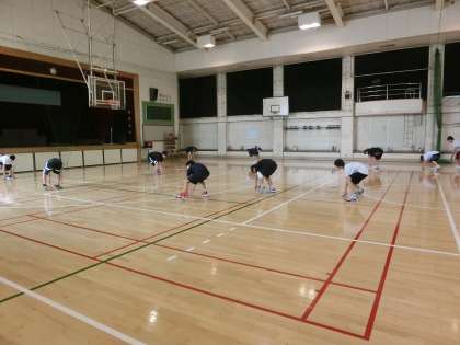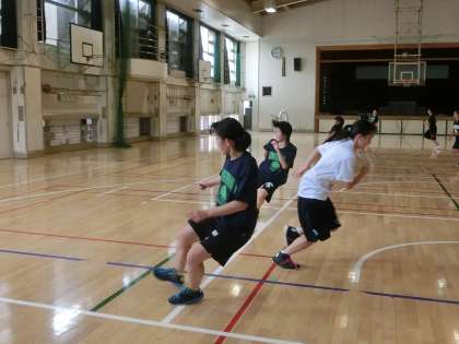 午前中の体育館では、バスケットボール部が活動しています。バスケットボールは、試合中にターンをくりかえし、常に走り続けます。フットワークは、膝を曲げ、腰を低くし、正面を向いて行いましょう。(遠藤)