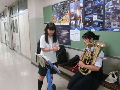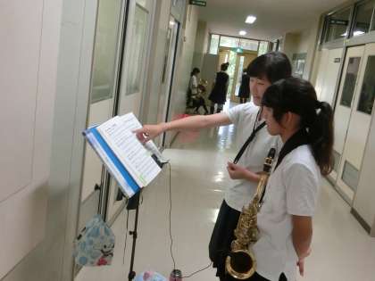 吹奏楽部の活動の様子です。8月6日のコンクールに向けて、3年生が、1年生に熱のこもった指導をしていました。1年生は、先輩の指導をよく聞いて上手に演奏できるようにがんばりましょう。(遠藤)