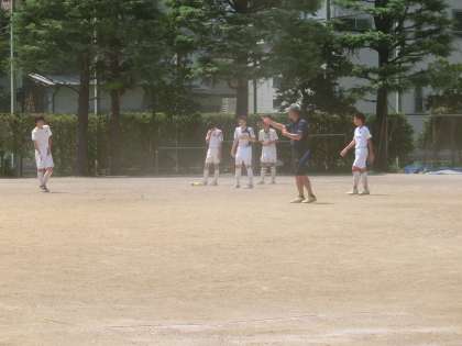校庭では、サッカー部が活動しています。顧問の水田先生の熱い指導の下、必死にボールを追いかけています。ゴールキーパーが声を出し、ディフェンスラインをうまくコントロールしていました。熱中症にならないようにこまめに水分補給をしましょう。(遠藤)