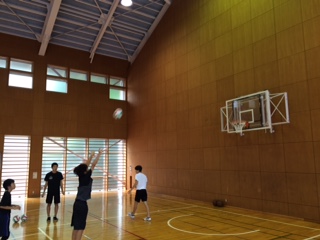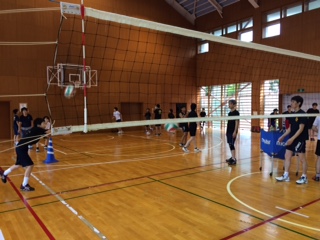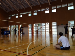 昼を食べ終え、合宿3日目午後の練習が始まりました。レシーバー、セッター、アタッカーの3つにわかれてポジション別の練習をしています。レシーバーはコーンをまわってボールをコーチに返す。アタッカーはコートの端に座ったコーチを狙って打つ。セッターはトスされたボールをバスケのゴールに入れる。それぞれのポジションで必要な技術を身につけましょう。(森川)