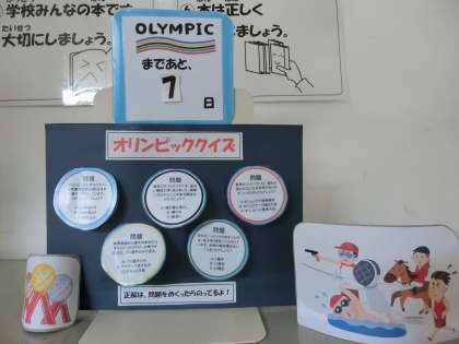 司書さんが、図書室前にオリンピックコーナーを作ってくれました。そこにオリンピッククイズがあります。図書室に行ってオリンピッククイズ全問正解に挑戦してみよう。(遠藤)