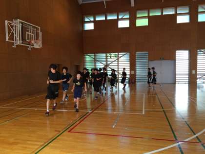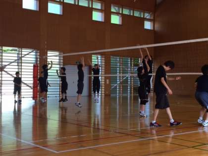 合宿最終日です。ウォームアップ、ブロックジャンプ、スパイク練習を終えたら2年生レギュラーチーム対大人でゲーム形式の練習をします。この午前の練習が終わったら、お昼を食べて東京に帰ります。一回は大人に勝とう!(森川)