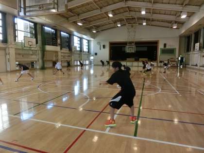 午後の体育館では、バスケットボール部が活動しています。フットワークはディフェンスの基本です。膝を曲げ、上体をおこしましょう。(遠藤)