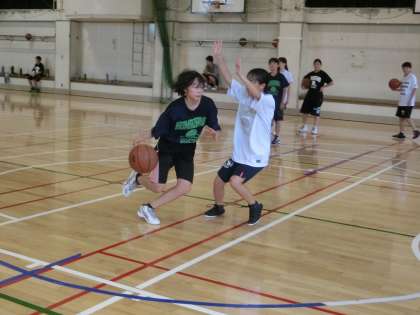 体育館では、バスケットボール部が活動しています。ボールミートからの1対1の練習をしていました。ボールの突き出しを早くし、トラベリングにならないようにしましょう。(遠藤)