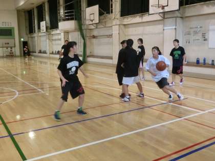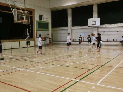 朝から、バスケットボール部が活動しています。男子は、課題であるシュート練習をしています。全速でドライブしてレイアップを決められるようにしましょう。女子は、スクリーンプレーの練習です。(遠藤)
