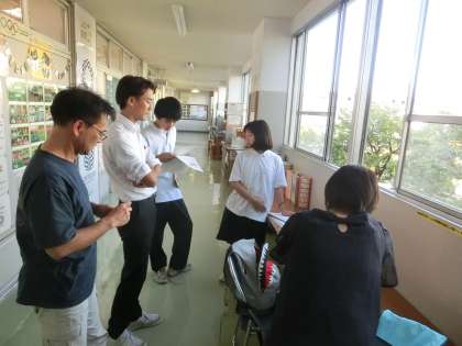 家庭科部の生徒が、「オレンジページ×味の素KKジュニア料理選手権」の応募するための料理を、担任の黒田先生、佐野先生、副担任の川原先生に試食してもらっています。先生方からのアドバイスを参考に、もうひと工夫してみましょう。(遠藤)