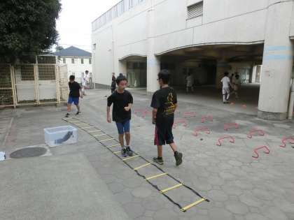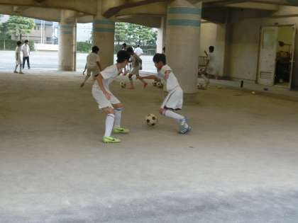 校庭で区立中学陸上競技大会の練習をしているため、サッカー部と陸上競技部はプール下で練習をしています。(遠藤)