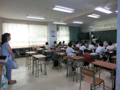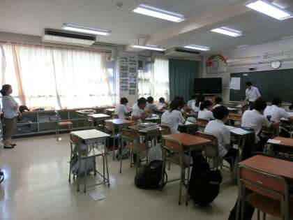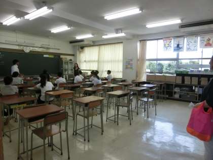 1年生の英語の様子です。日付を確認したり、英語の歌を聴いたりしていました。本日から学校公開週間なので、保護者が来校し、授業を参観しています。(遠藤)