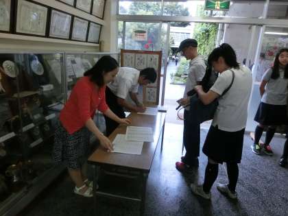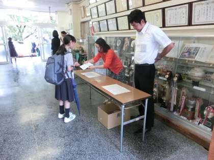 今朝、昇降口で漢字検定の申し込みを受け付けていました。多くの生徒が申し込みにきていました。全員合格目指してがんばりましょう。(遠藤)
