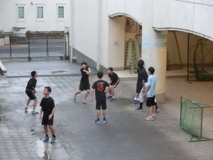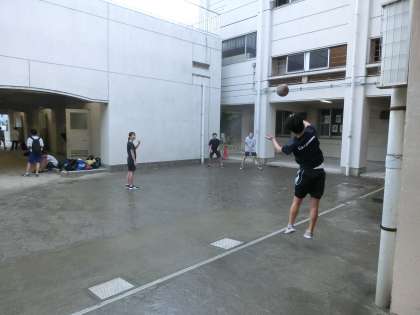小雨の降る中、バレーボール部が練習していました。足元が滑りやすくなっているので注意しましょう。(遠藤)