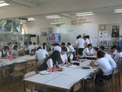 3年生の美術の様子です。色を使って立体的に見える絵を描いていました。(遠藤)