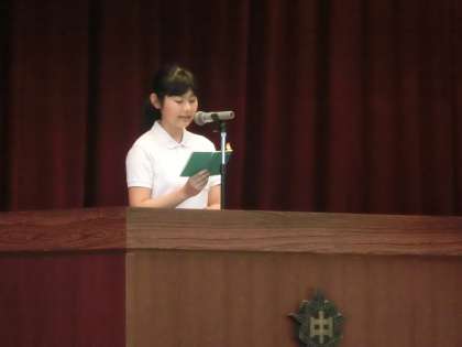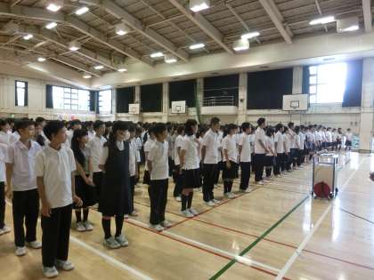今朝、生徒会朝礼が行われました。生徒会本部役員や各専門委員会から、前期の反省や後期への申し送り事項が伝えられました。(遠藤)