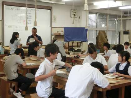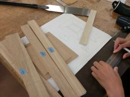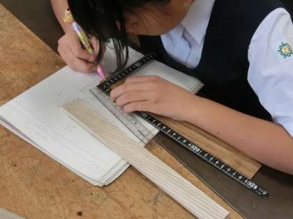 2年生の技術の授業の様子です。木の箱を作っています。デザインした寸法通りに切れるように、正確に印をつけましょう。(遠藤)