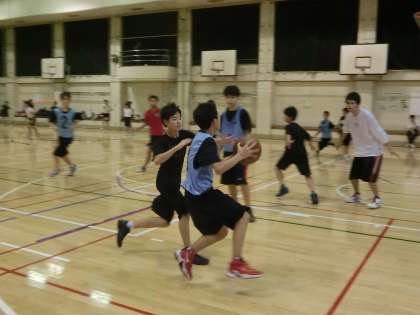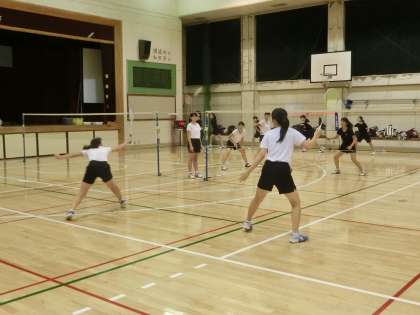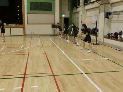体育館では、バドミントン部と男子バスケットボール部が活動しています。バドミントン部は2年生が実戦練習、1年生は素振りをしていました。男子バスケットボール部は5対5をやっていました。(遠藤)