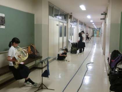 格技室では、剣道部が活動していました。音楽室前の廊下では、吹奏楽部の1年生が練習していました。(遠藤)