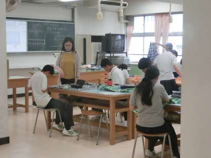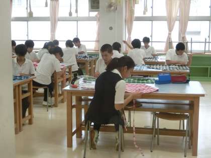 1年A組の家庭科の様子です。夏休みにデザインしたエプロンの制作をしていました。本返し縫いをきちんとしましょう。(遠藤)