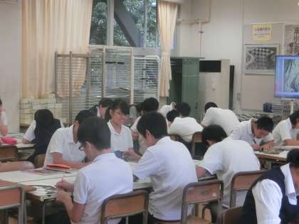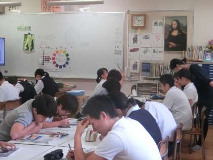 3年D組の美術の授業の様子です。色で立体感を出す絵を描いています。(遠藤)