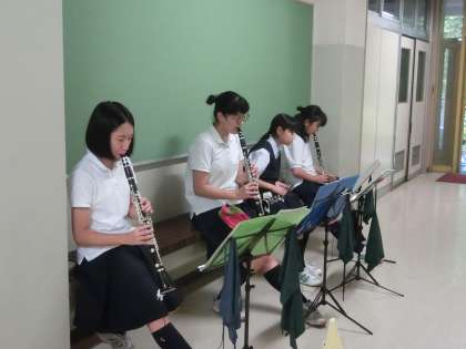 吹奏楽部が音楽室で活動しています。小学生体験入学のセレモニーで演奏する曲や合唱コンクールで演奏する曲を練習していました。(遠藤)