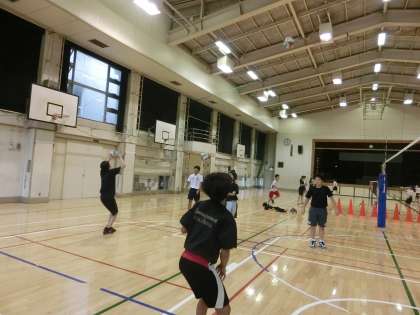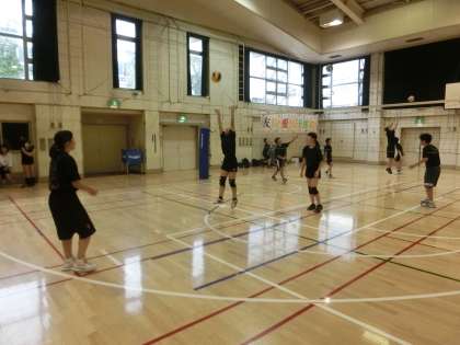 体育館では、バレーボール部が活動しています。金曜日は、半面を男女で分けるので、4分の1面での練習です。スペースをうまく使って練習していますね。(遠藤)
