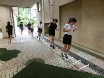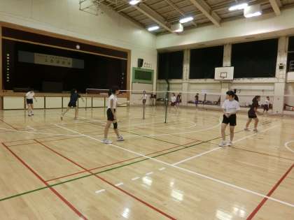 バドミントン部の活動の様子です。立会演説会のリハーサルが終わるまでは、外でラダートレーニングをしていました。リハーサル終了後は体育館で、実践的な練習をしていました。(遠藤)