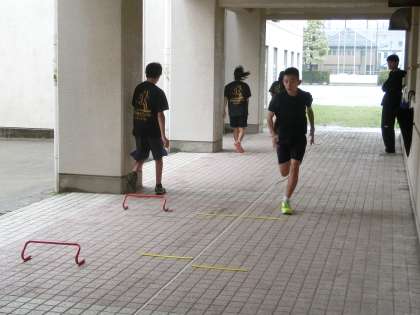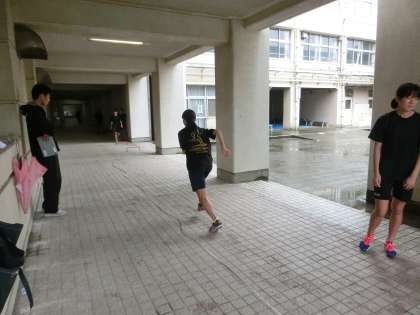 音楽室前で陸上競技部が活動しています。大股走で自分のストライドを伸ばすトレーニングをしていました。(遠藤)