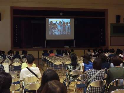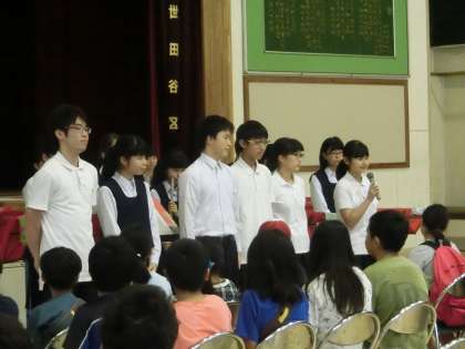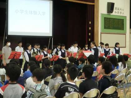 授業見学のあとは、体育館で歓迎セレモニーです。生徒会本部役員による中学校の説明や吹奏楽部の演奏、学校紹介ビデオの上映などで小学生を迎えます。(遠藤)