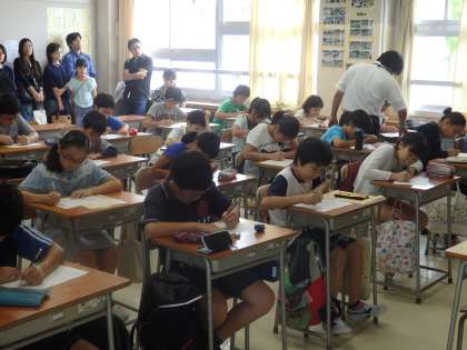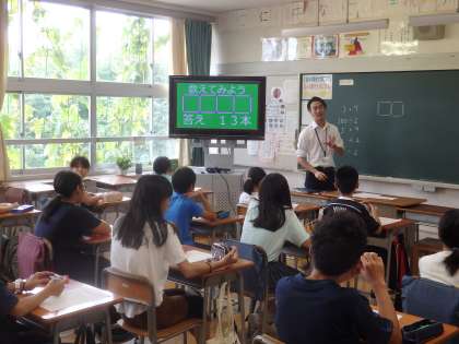 いよいよ体験授業です。数学の授業の様子です。ストローの本数を正方形の個数にもとづいて計算する方法を考え、文字式で表しました。(遠藤)