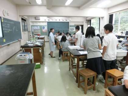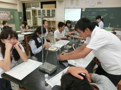 1年生の理科の授業の様子です。水とエタノールの沸点の違いを利用して、みりんを加熱してエタノールを取り出す実験をしています。(遠藤)