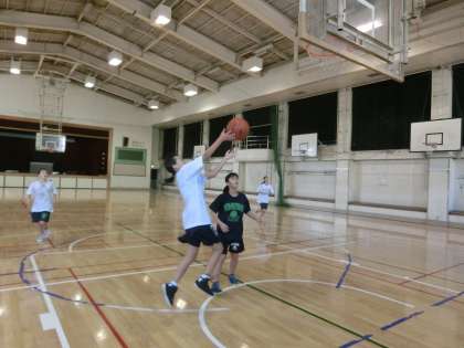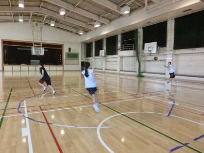 朝から、女子バスケットボール部が活動しています。2メンや3メンは、走るコースが重ならないように、3線速攻を意識しましょう。(遠藤)