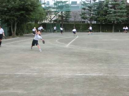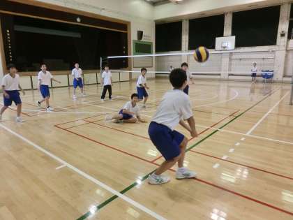 1年生の体育の授業の様子です。男子は体育館でバレーボールです。バレー部の生徒がサーブを打ち、それを3回以上パスして相手コートに返せたら1点というゲームをしていました。女子は校庭でソフトボールをしています。ゴロを捕球して1塁に送球する練習をしていました。(遠藤)