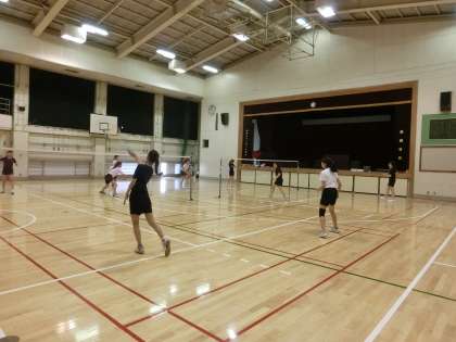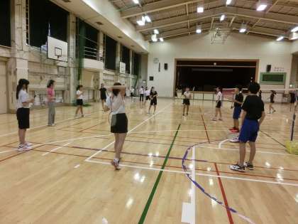 体育館では、バドミントン部が活動しています。2年生は実戦的な練習です。1年生は基本的な素振りから確認していました。(遠藤)