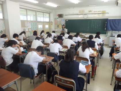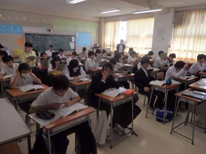 各学年の道徳の授業の様子です。1年C組は松本教諭の2年次研修研究授業で、「島耕作 ある朝の出来事」を題材に、公共の場における態度について考えました。先生の朗読に合わせて真剣に教材を読む姿勢がとてもすばらしかったです。2年生は、「ネパールのビール」を題材に、人としての誇りある生き方とはどういうものかを考えました。ICTを活用した授業で、生徒たちも反応がよく活発な授業でした。3年D組では小山教諭の3年次研修研究授業で、「てんびんばかり」を題材に働くことの意義について考えました。授業に対する姿勢、深く考える取り組み、自分の考えを表現する力、最高学年にふさわしいすばらしい取り組みでした。(田村)
