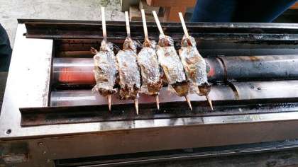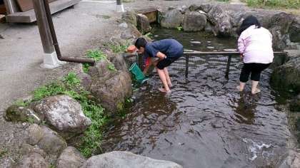 富士宮市にある養鱒場で、ニジマスのつかみ取りを体験しました。捕った魚を直ぐに塩焼きにしていただきました。