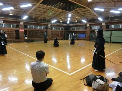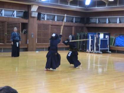 格技室では、剣道部が活動していました。部内戦の真剣勝負を副校長先生が見守っていました。(遠藤)