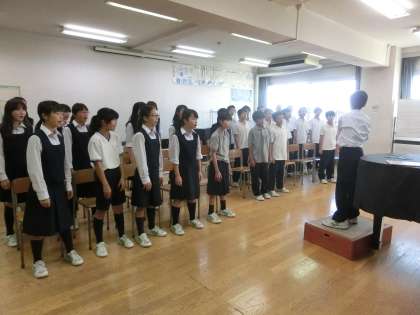 1年D組の合唱コンクール放課後練習の様子です。第1音楽室で、合唱コンクール実行委員を中心に練習しています。強弱を意識して歌う練習をしていました。(遠藤)